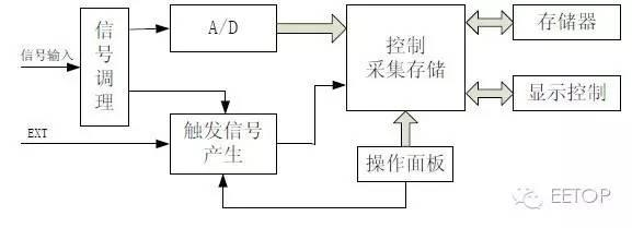 数字示波器主要包括信号调理电路、采集和存储部分电路、触发电路、软件处理及显 示部分,其基本的电路框图如下所示。