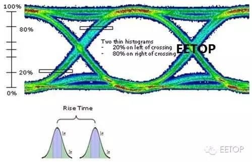 一般测量上升及下降时间是以眼图占 20%~80%的部分为主,其中上升时间如下图,分别以左侧交叉点左侧(20%)至右侧(80%)两块水平区间作此传递信号上升斜率时间之换 算,计算公式如下: