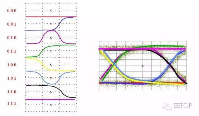 如果示波器的整个显示屏幕宽度为 100ns,则表示在示波器的有效频宽、取样率及记忆体配合下,得到了100ns下的波形资料。但是,对于一个系统而言,分析这么短的时间内的信号并不具有代表性,例如信号在每一百万位元会出现一次突波(Spike),但在这 100ns时间内,突波出现的机率很小,因此会错过某些重要的信息。如果要衡量整个系统的性能, 这么短的时间内测量得到的数据显然是不够的。设想,如果可以以重复叠加的方式,将新的信号不断的加入显示屏幕中,但却仍然记录着前次的波形,只要累积时间 够久,就可以 形成眼图,从而可以了解到整个系统的性能,如串扰、噪声以及其他的一些参数,为整个系统性能的改善提供依据。 分析实际眼图,再结合理论,一个完整的眼图应该包含从“000”到“111”的所有状态组,且每一个状态组发生的次数要尽量一致,否则有些信息将无法呈现在屏幕上,八种状态形成的眼图如下所示:
