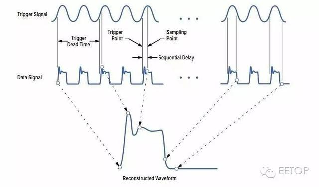 采样示波器,即等效时间采样的方法采用从重复性信号的不同的周期取得采样点来重 建这个重复性信号的波形,它仅测量采样瞬间波形的瞬时幅度,这样就提高了示波器的时间分辨率。与实时示波器不同,采样示波器的一次触发只对输入信号采样一次,下次触发进会增加一个小小的延迟,然后进行采样。为了填满一个完整的波形记录,就需要进行多次触发。测量带宽由采样器的频率响应决定,测量带宽可以达到很高。
