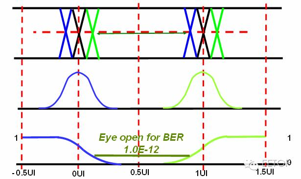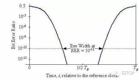 上述两图中,BER 图与眼图时间轴相同,两侧与眼图边沿相对应,样点位于中心。BER 一定时,曲线之间的距离是该 BER 上的眼图张开程度。在样点接近交点时,抖动会导致 BER 提高到最大 0.5。