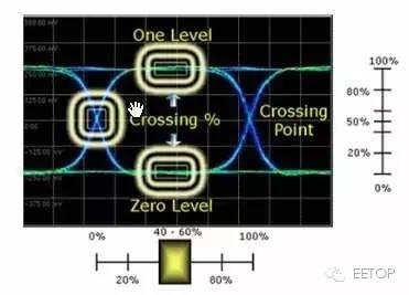 (2) 眼交叉比 眼图交叉比,是测量交叉点振幅与信号“1”及“0”位准之关系,因此不同交叉比例关系可传递不同信号位准。一般标准的信号其交叉比为 50%,即表示信号“1”及“0”各 占一半的位准。为了测量其相关比率,使用如下图所示的统计方式。交叉位准是依据交叉点垂直统计的中心窗口而计算出来的平均值,其比例方程式如下(其中的 1及 0 位准是取 眼图中间的 20%为其平均值,即从 40%~60%中作换算):