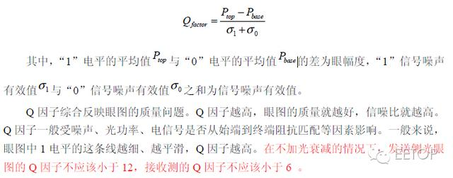Q 因子是用于测量眼图信噪比的参数,它的定义是接收机在最佳判决门限下信号功率 和噪声功率的比值,可适用于各种信号格式和速率的数字信号,其计算公式如下: