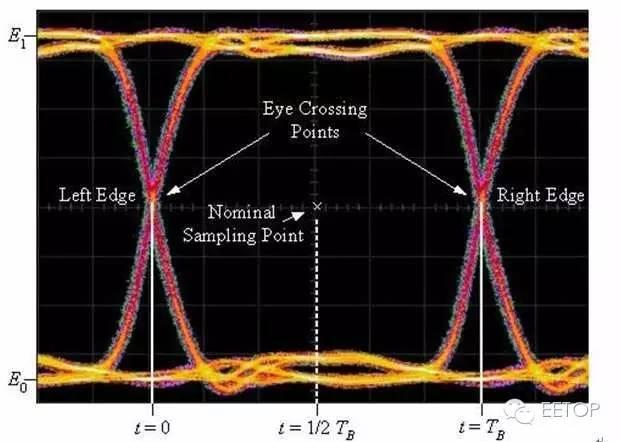 眼宽反映信号的总抖动,即是眼图在水平轴所开的大小,其定义为两上缘与下缘交汇 的点(Crossing Point)间的时间差。交叉点之间的时间是基于信号中的两个零交叉点处的直方图平均数计算而来,每个分布的标准偏差是从两个平均数之间的差值相减而来。 眼高即是眼图在垂直轴所开的大小,它是信噪比测量,与眼图振幅非常相似。