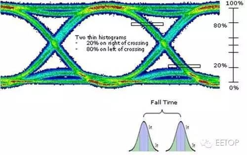 我们知道,时间位准 20%及 80%是与信号位准 1 及 0 有着相关性的。当然,如果上升 时间愈短,即愈能表现出眼图中间的白色区块,即代表可传递的信号及容忍误码比率较好。 而对于眼图下降时间如下图所示,分别以右侧交叉点左侧(80%)至右侧(20%)两块水平区间 作此信号传递下降斜率时间之换算,计算公式如下: