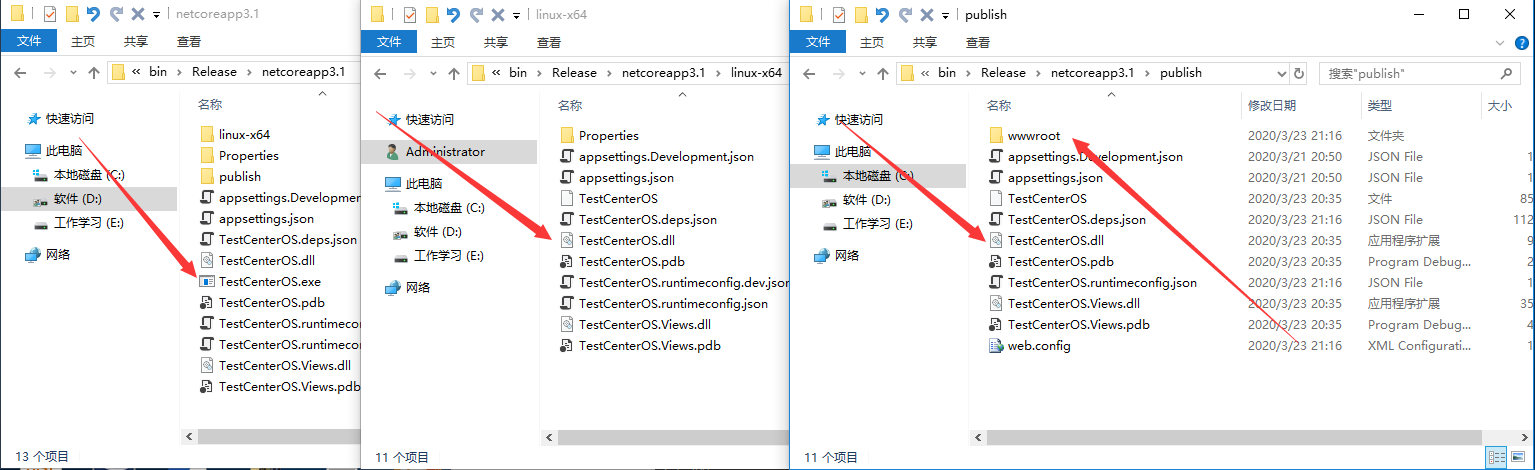 发布完成后,我们会发现以上3个目录都 TestCenterOS.dll,说明三个目录都是可以进行部署的,但是有所区别的是publish目录下包含wwwroot目录,我们知道.Net Core项目的静态文件是放在wwwroot目录中的。所以虽然其他两个目录可以部署运行,但是会缺少静态文件。所以我们选择publish目录进行部署。