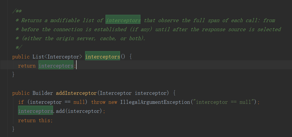 这里需要强调的一下 interceptors.addAll(client.interceptors()); ,client.interceptors() 是我们自定义的拦截器 它是在哪定义的?如何添加?我们去OkHttpClient类中发现:
