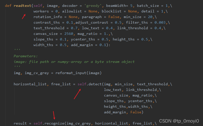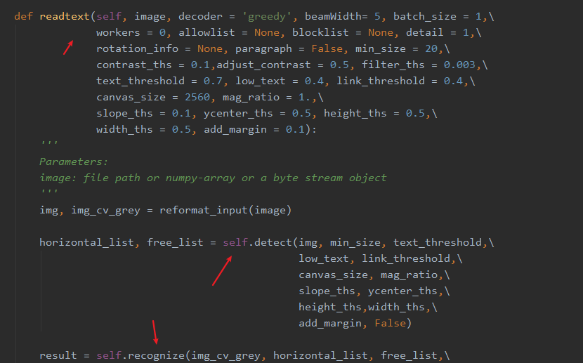 readtext 函数是将 detect 和 recognize 方法相结合:先利用 detect 函数识别图像中文本框的位置坐标,将坐标列表输入 recognize 进行识别,最终返回每个文本信息及位置坐标,函数框架如下: