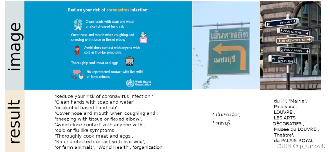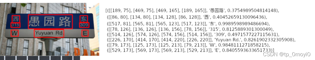 对比传统 OCR 只具有图片文本识别之外,EasyOCR 还具有 文本检测 功能(图片中识别到的文本框,在图片中的定位以 左上、右上、右下、左下 坐标顺序依次返回),效果如下图: