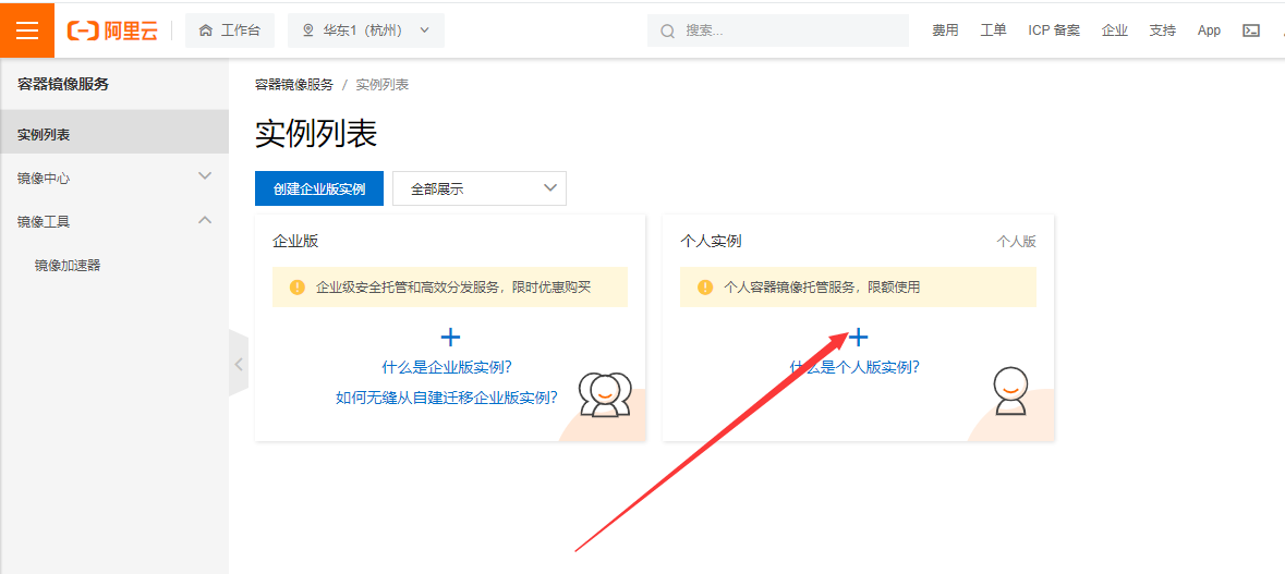 1.2 进入控制台,搜索"容器镜像服务",在实例列表中添加一个个人实例,用来存储个人镜像,按要求创建个人实例即可,如图所示: