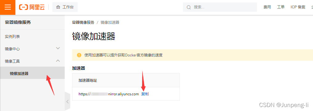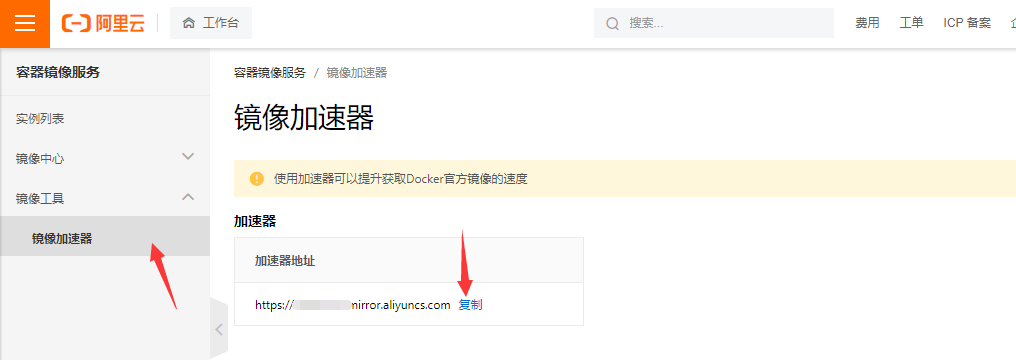 获取镜像加速器地址,如图所示: