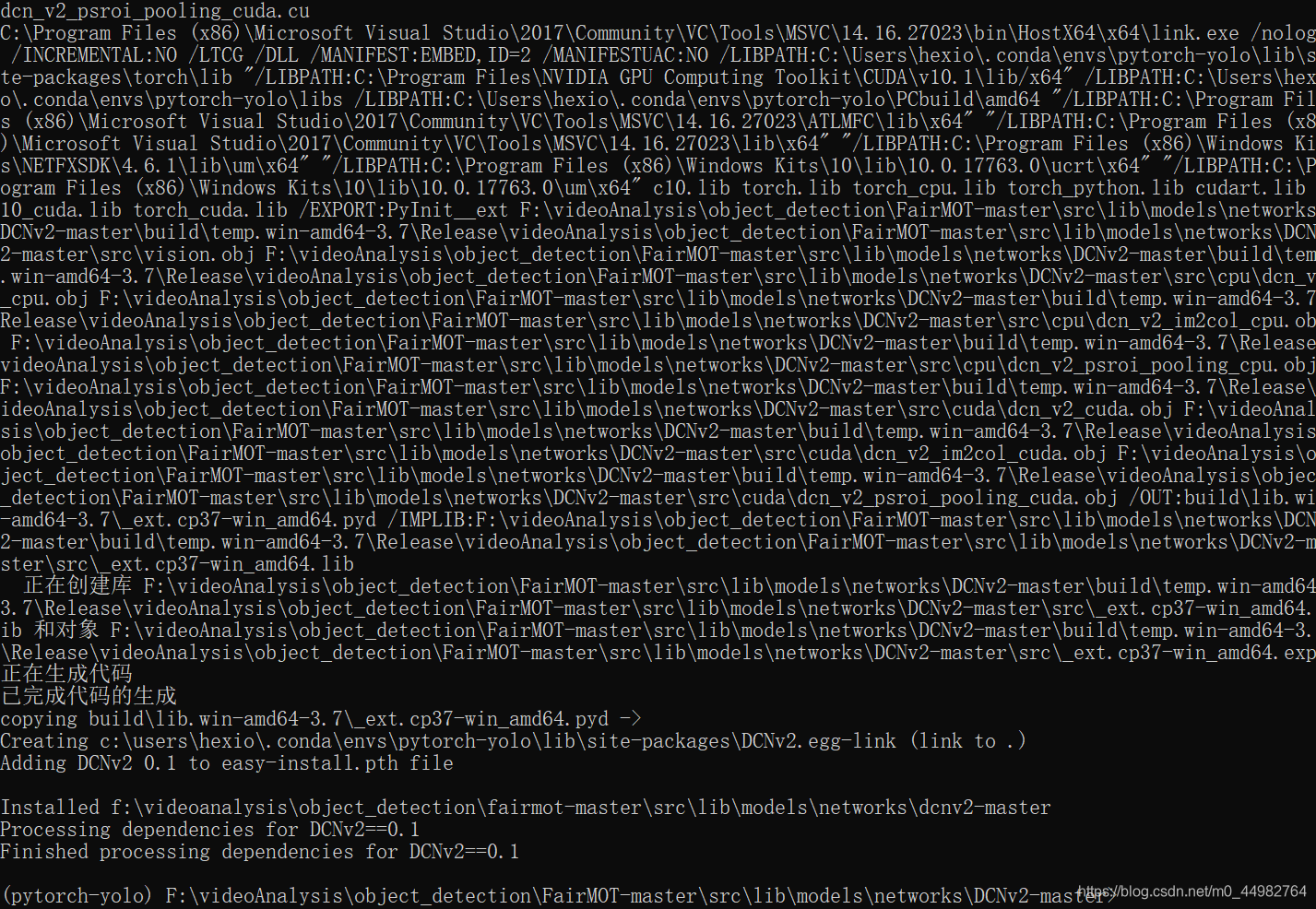 我的环境是,cuda10.1,python3.7,pytorch1.7.1,为了跑FairMOT模型,需要编译DCNv2,在windows上编译报错,最后成功解决。