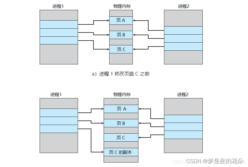 但主进程是可以有数据写入的,这时候就会拷贝物理内存中的数据。如下图(进程1看做是主进程,进程2看做是子进程):