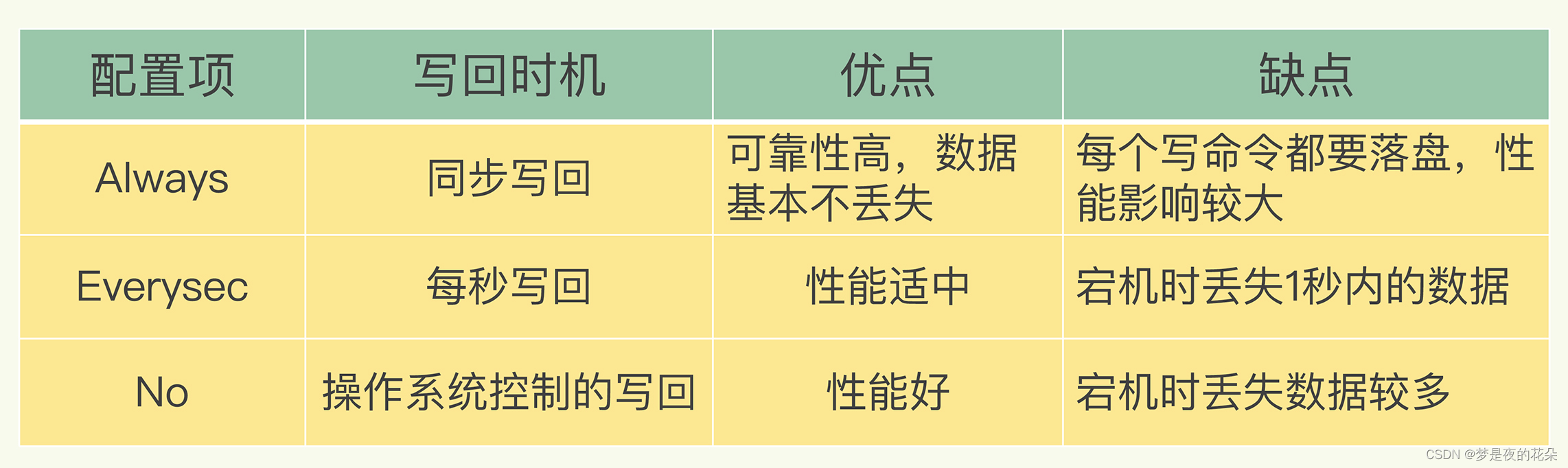 - Always,同步写回:每个写命令执行完,立马同步地将日志写回磁盘;
