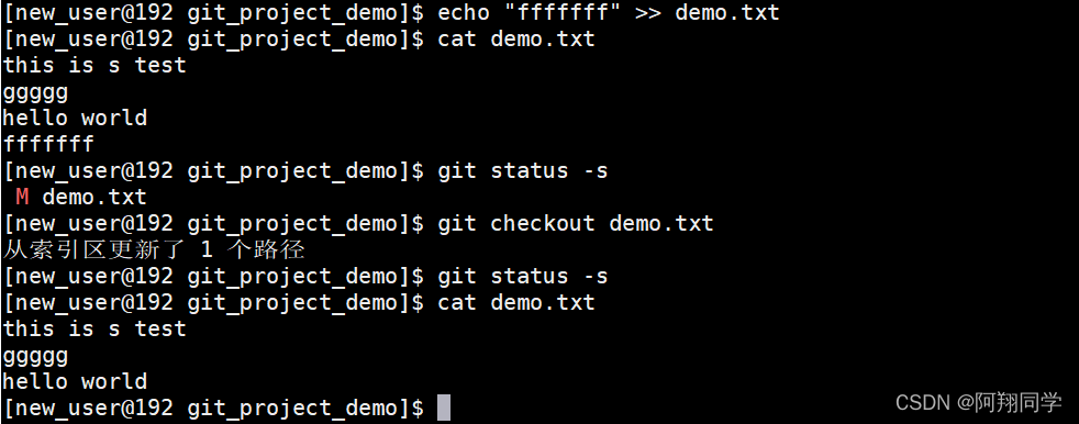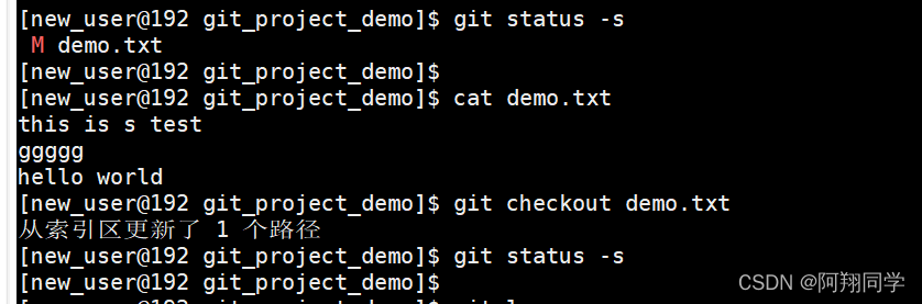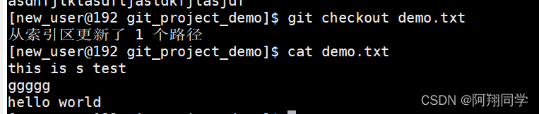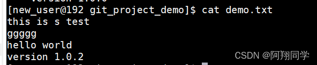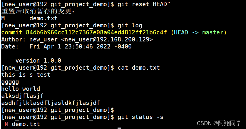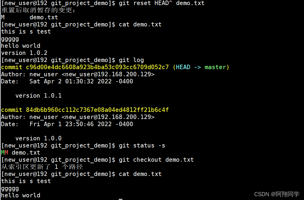 指定回退文件,回退 demo.txt 文件的版本到上一个版本,demo和demo2的文件内容并没有变更,同样需要checkout一下demo。【这种方式并没有撤销提交,只是版本指针从1.0.1移动到1.0.0】