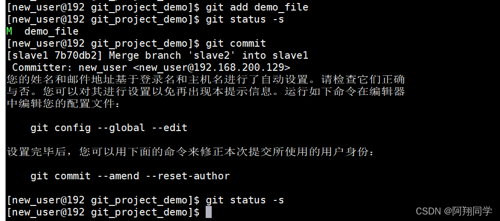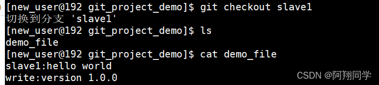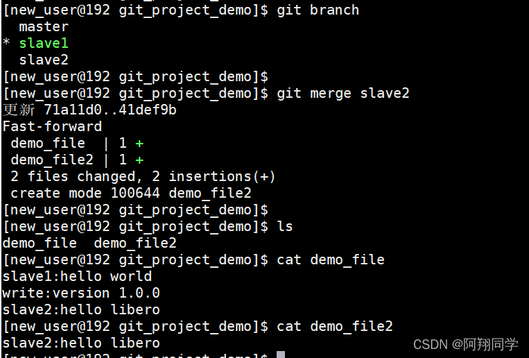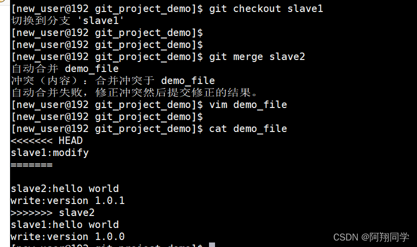 基于slave1分支创建分支slave2,在slave2中修改demo_file文件并提交,在slave1中修改demo_file文件并提交,然后在slave1分支上合并slave2【需要手动的解决冲突】