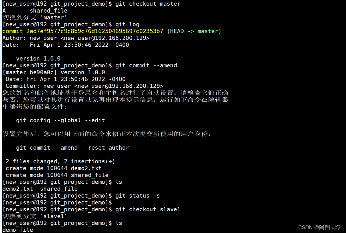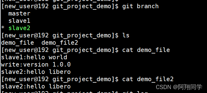 1)基于slave1分支创建出slave2分支。在slave2分支中增加了demo_file2文件,并且对原来的demo_file文件进行了修改。