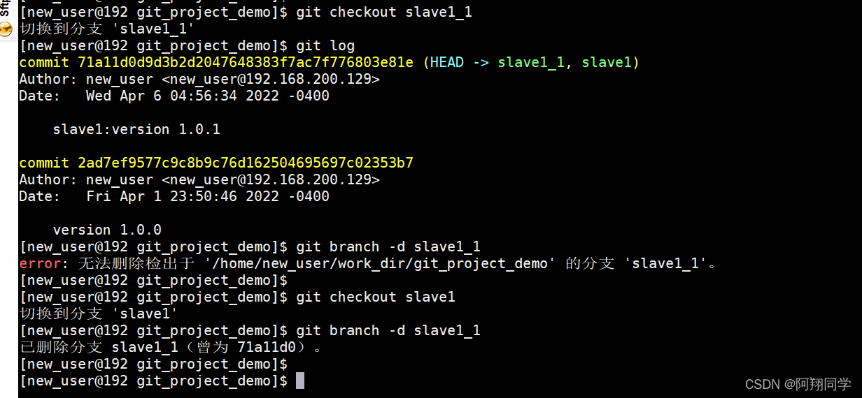 3)删除分支【基于slave1创建的slave1_1, 在本分支上删除自己是不可以的,要到其他分支上】