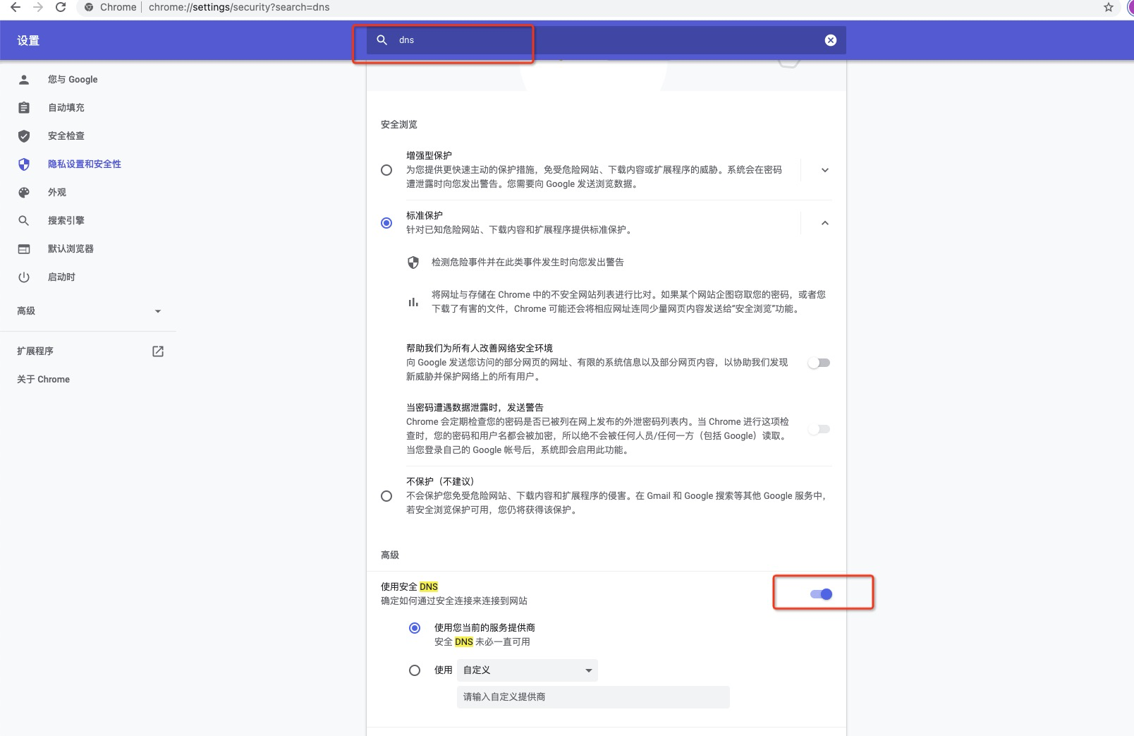 并且,使用其他浏览器打开就很快,然后开始百度,最终发现,是chrome有一个默认设置,设置项的名称是 使用安全dns,关闭该选项即可