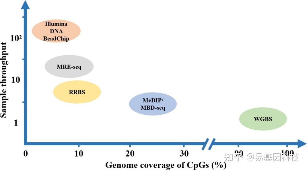 图4:不同DNA甲基化分析技术的基因组覆盖率和样本量