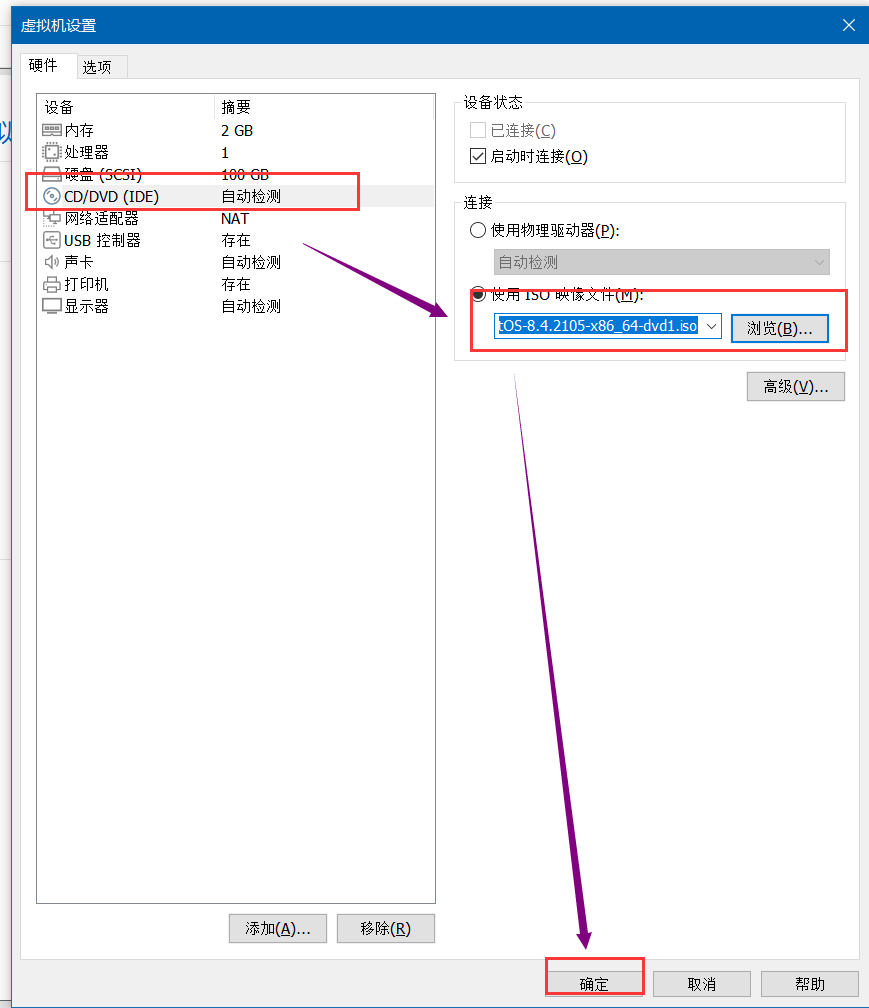 2.点击CD/DVD(IDE)->使用映像文件->确定