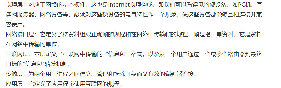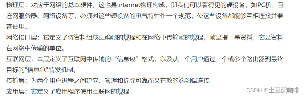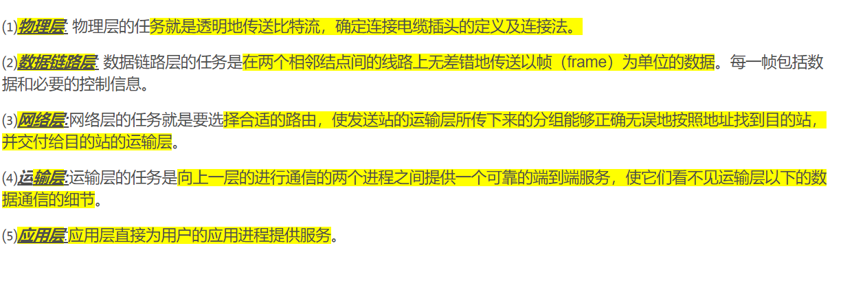 物理层: 物理层的任务就是透明地传送比特流。物理层还要确定连接电缆插头的定义及连接法。