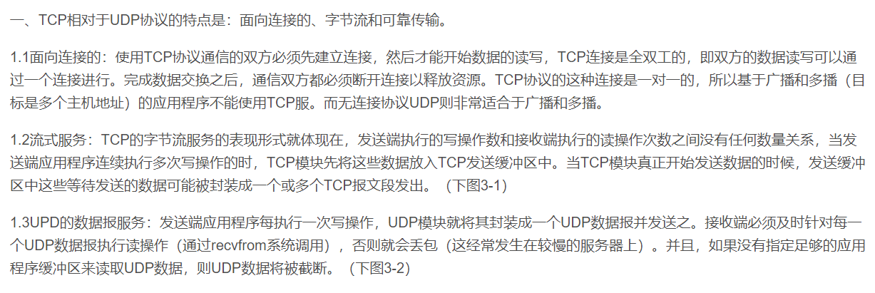 TCP---传输控制协议,提供的是面向连接、可靠的字节流服务。当客户和服务器彼此交换数据前,必须先在双方之间建立一个TCP连接,之后才能传输数据。TCP提供超时重发,丢弃重复数据,检验数据,流量控制等功能,保证数据能顺序地从一端传到另一端。