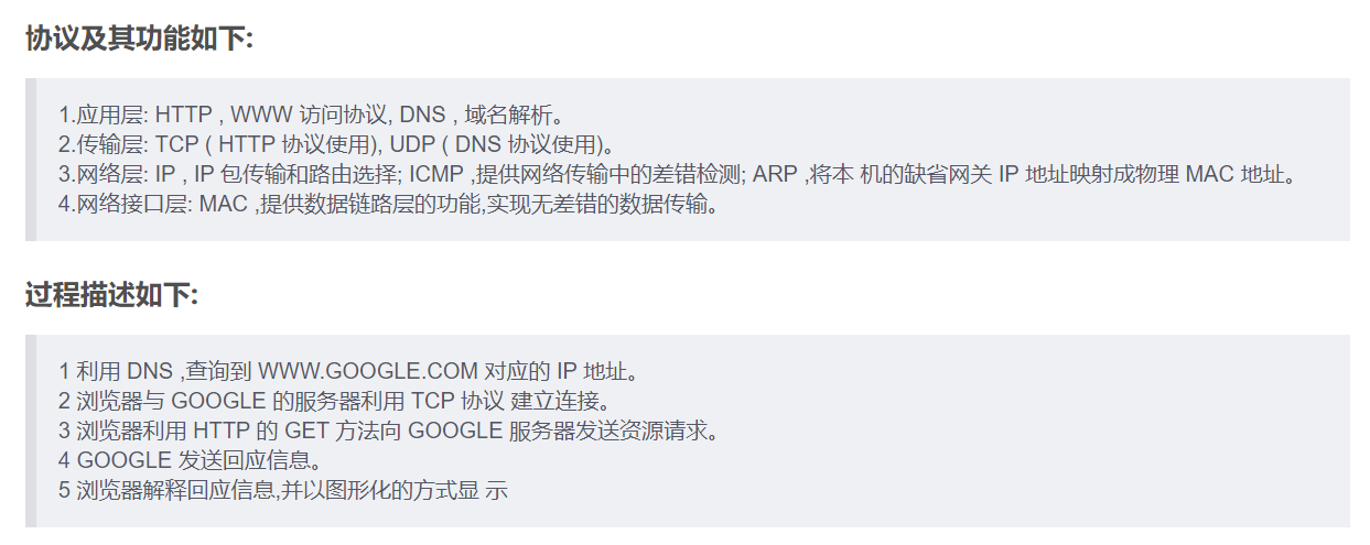 13一名学生A 希望访问网站www.google.com。学生A 在其浏览器中输入http://www.google.com 并按回车,直到Google 的网站首页显示在其浏览器中,请问:(1) 在此过程中,按照TCP/IP 参考模型,从应用层(包括应用层)到网络接口层(包括网络接口层)都用到了哪些协议,每个协议所起的作用是什么? 简要描述该过程的流程(可用流程图描述)