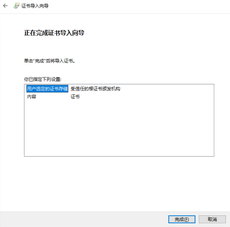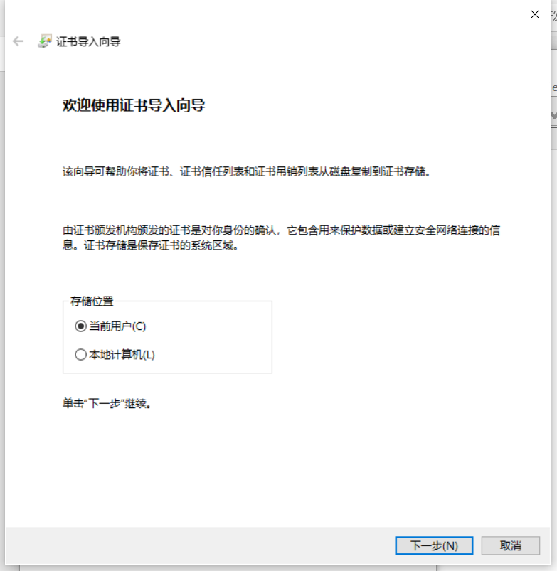 “安装证书”-->默认选择“当前用户”-->选择“将所有证书都放入下列存储”-->选择“受信任的根证书颁发机构”-->“确定”-->“完成”。