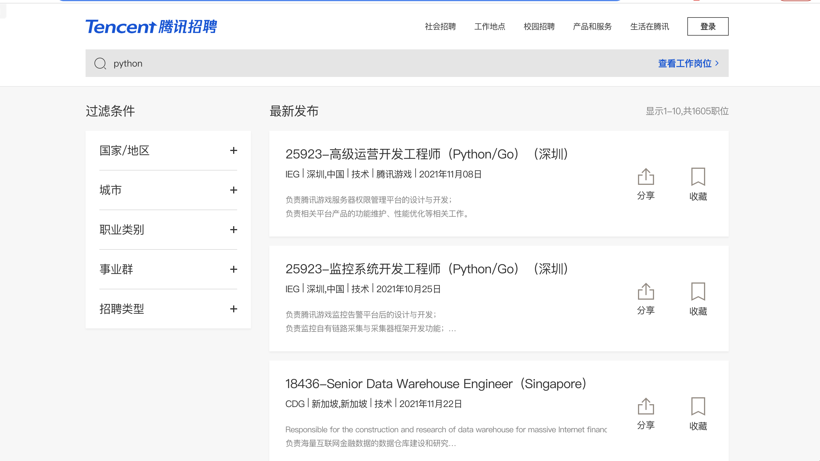 以腾讯招聘网站为例,打开网站,搜索“python”,返回页面如下: