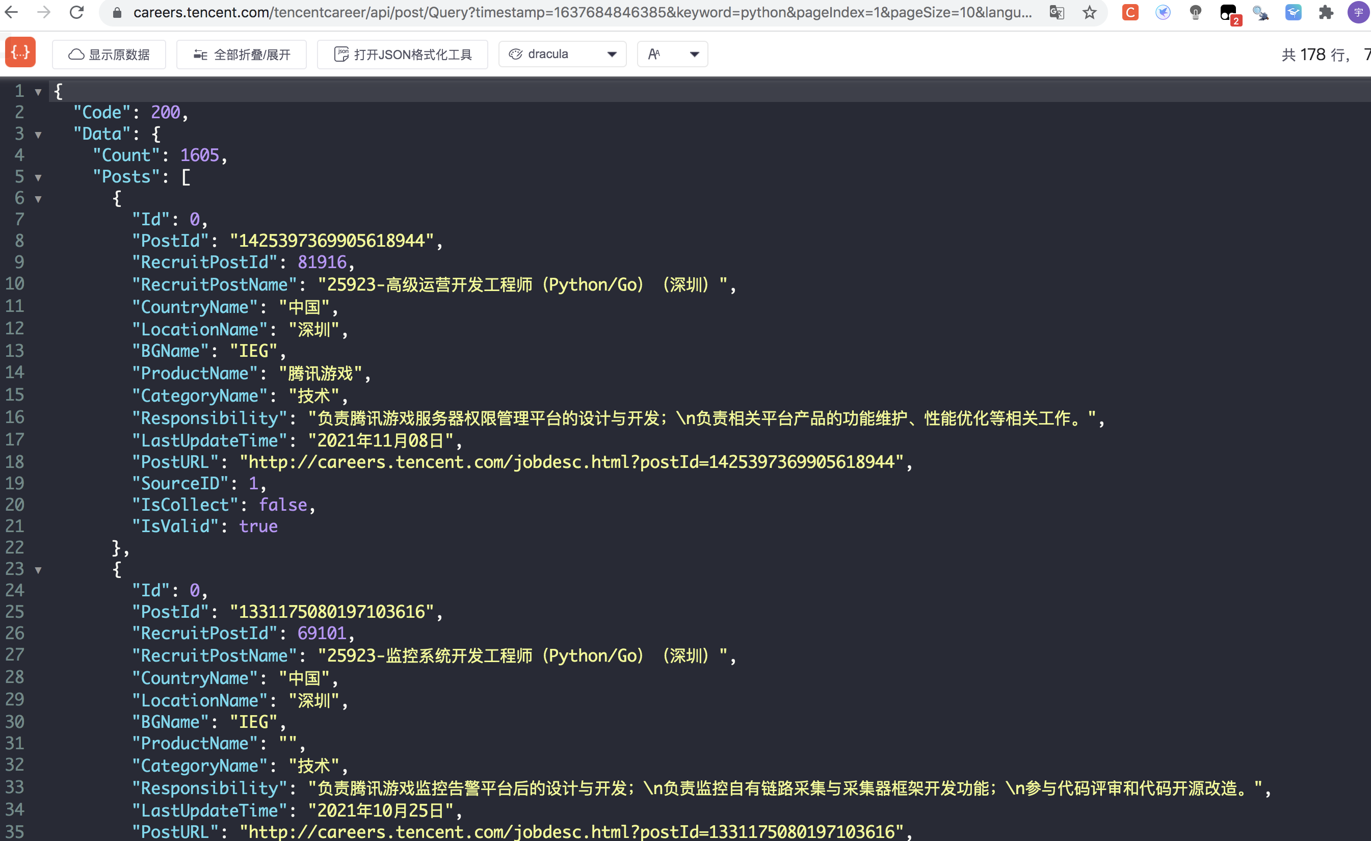 Request URL: https://careers.tencent.com/tencentcareer/api/post/Query?timestamp=1637684846385&keyword=python&pageIndex=1&pageSize=10&language=zh-cn&area=cn当我们把简化后的请求链接放在浏览器中,返回的便是json格式的内容(因为浏览器装了jsonview插件,所以如下显示),如下: