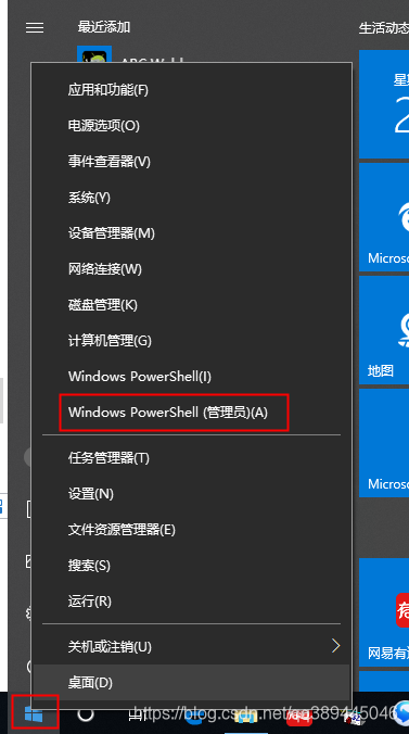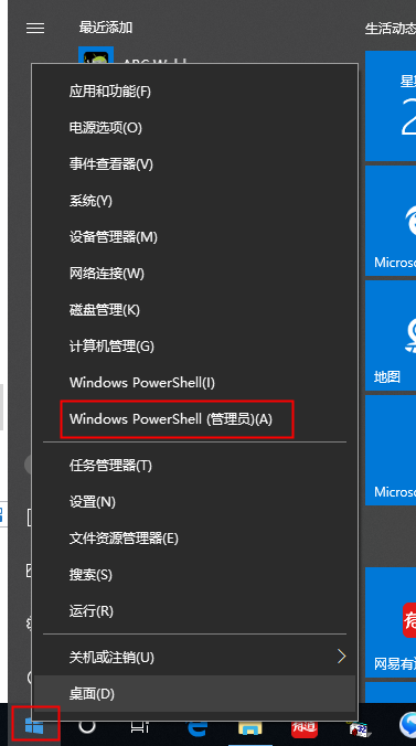 鼠标右击“开始”菜单,点击“Windows PowerShell(管理员)(A)”