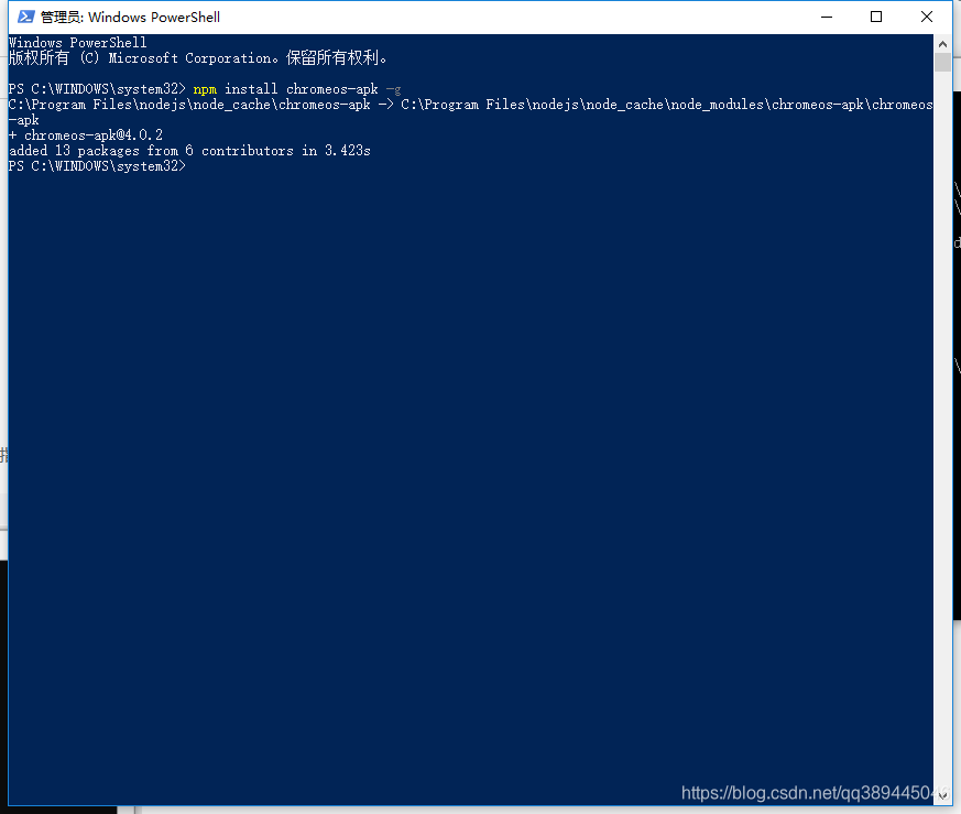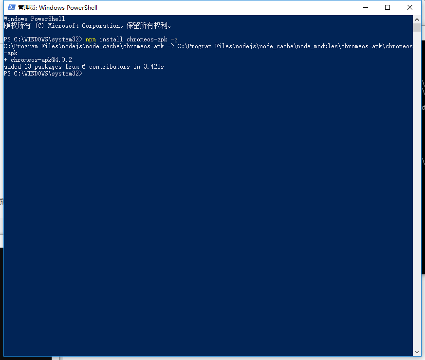 npm ERR! C:\Users\admin\AppData\Roaming\npm-cache\_logs\2020-03-21T09_36_33_126Z-debug.log在Windows10系统中利用npm安装chromeos-apk出现“Error: EPERM: operation not permitted, mkdir 'C:\Program Files\nodejs\node_cache\node_modules\.staging'”的问题。