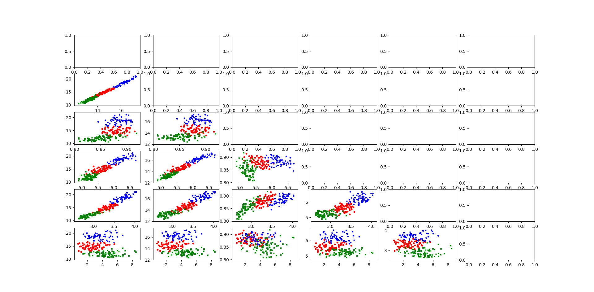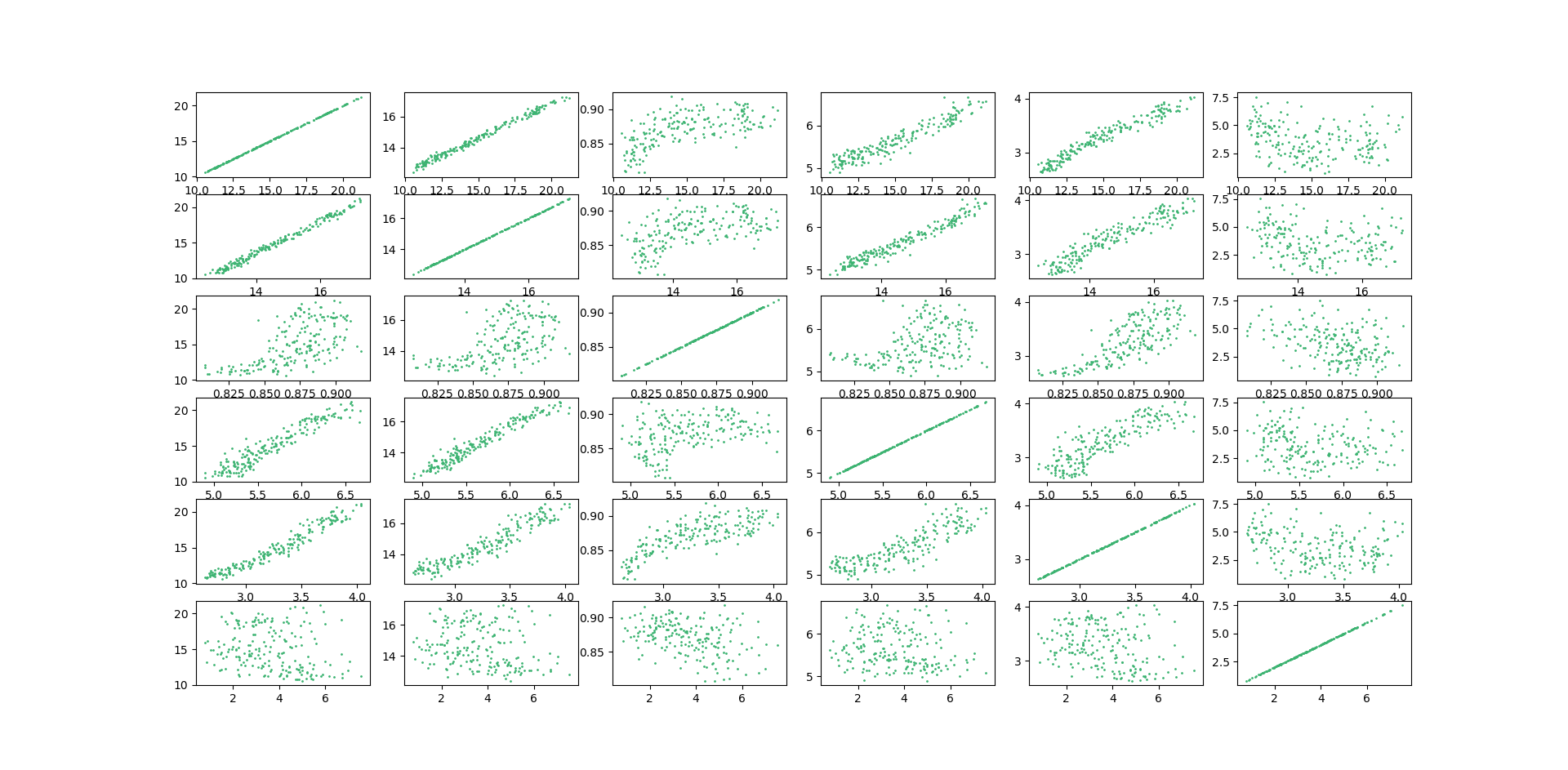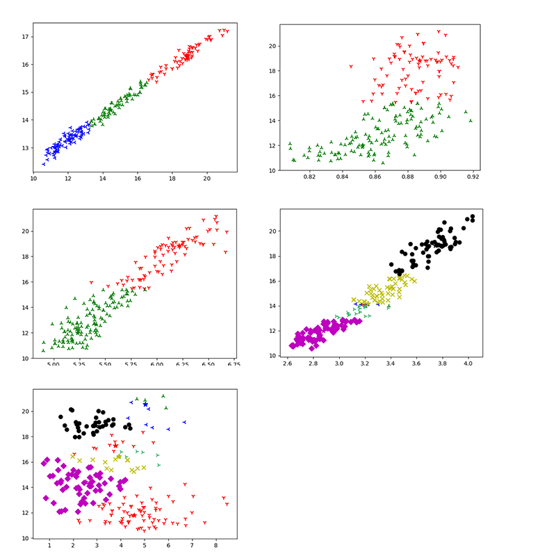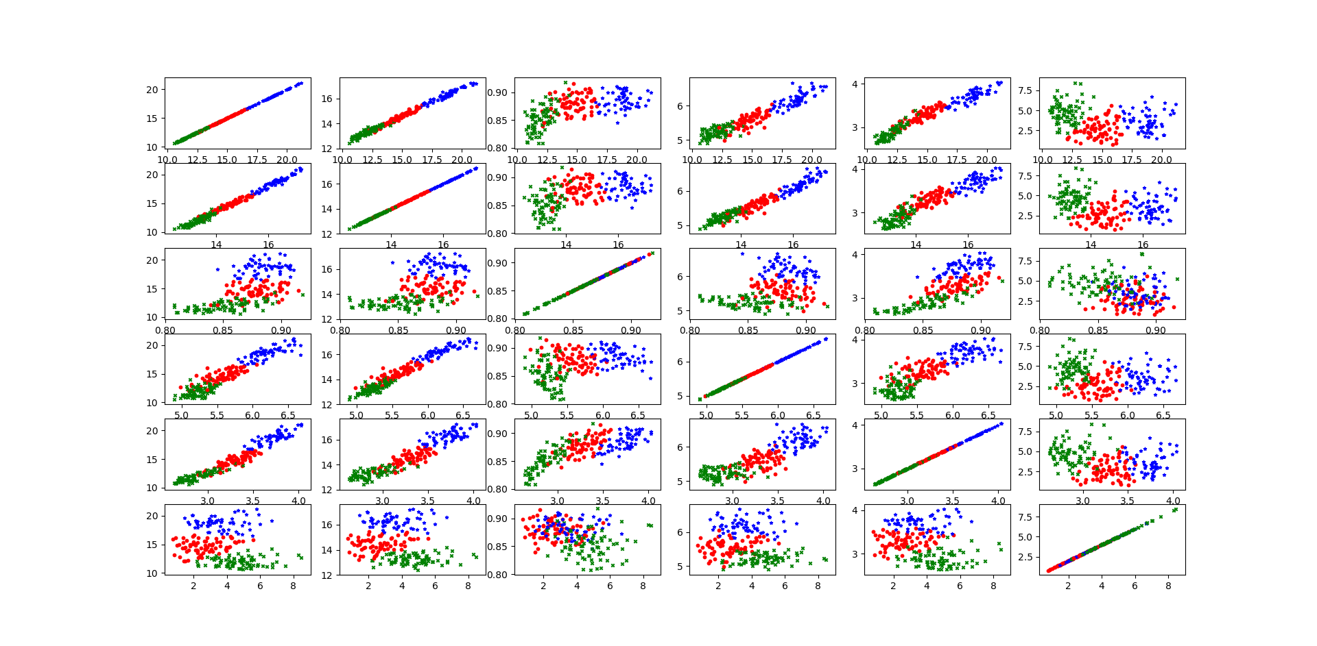 首先检查数据文本,未发现空缺数据,之后导入“Seeds Data Set”的数据并两两属性交叉对其进行绘图观察,绘制的散点图如图2.1所示。从图中能够看出该数据集的数据较为规整,未出现噪音数据及离群数据。又因为该数据集实列数较少、属性值数较少,故在导入数据时可直接导入,不对其进行预处理。