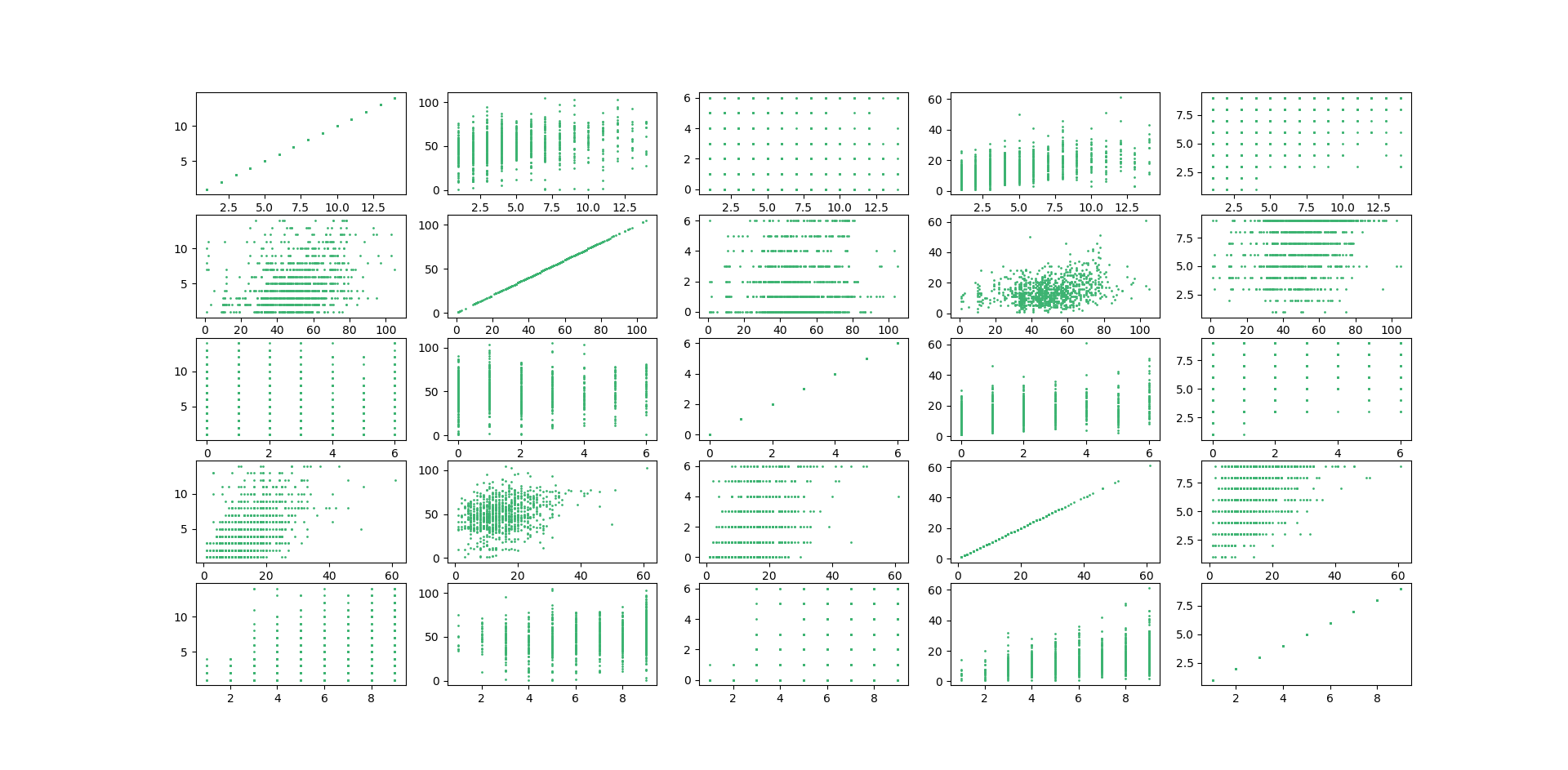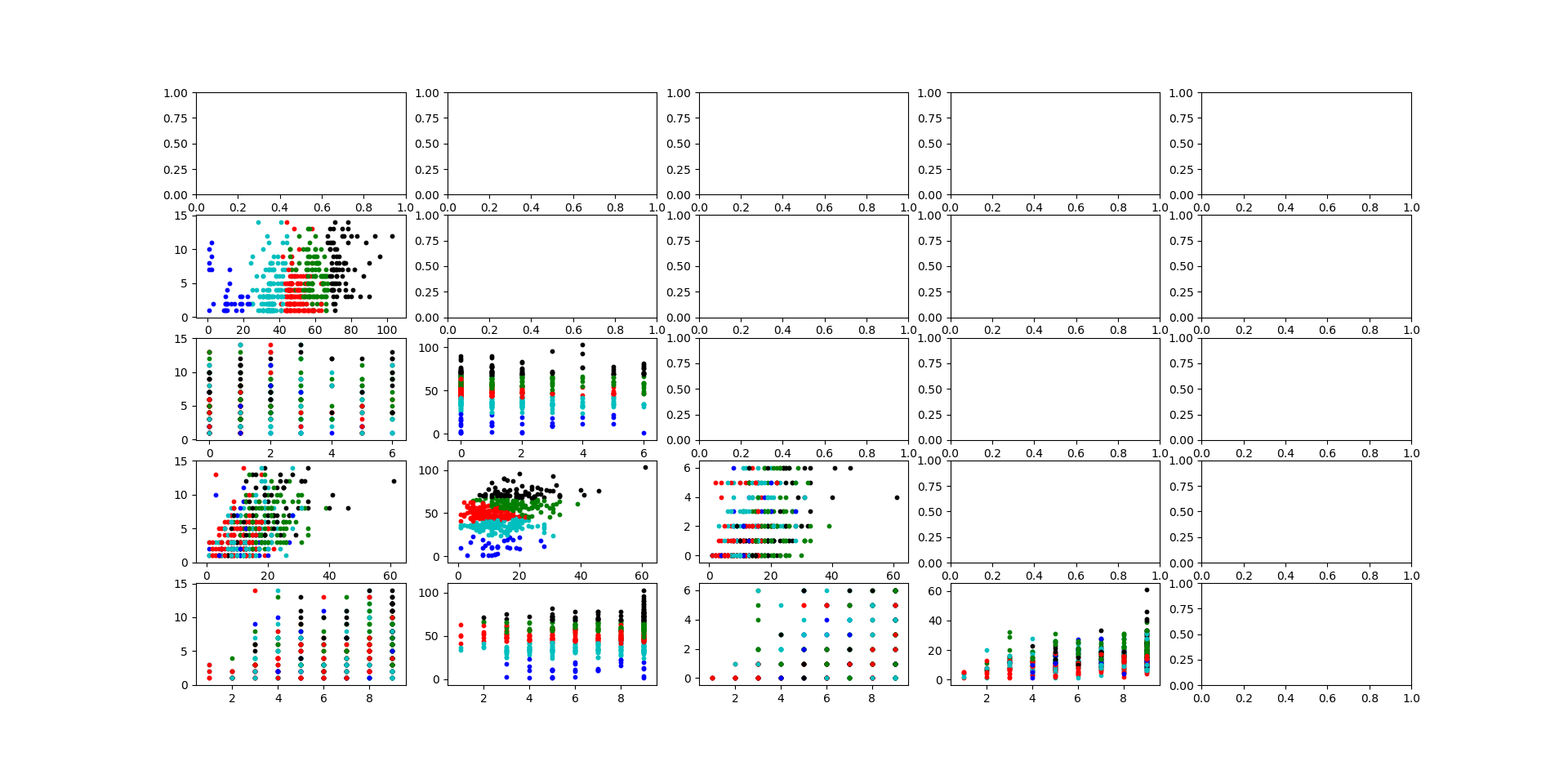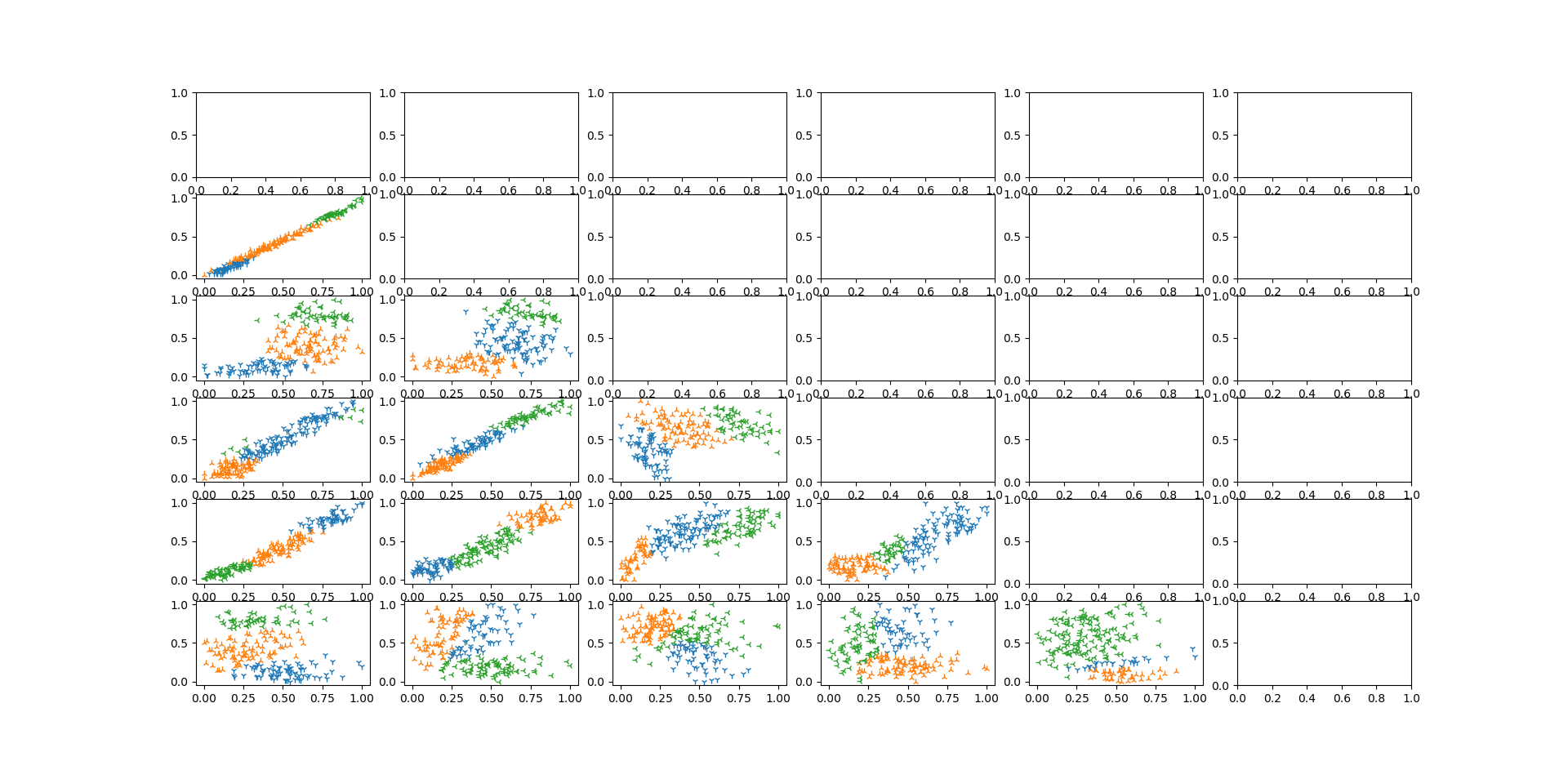 首先检查数据文本,未发现空缺数据,之后导入“Seeds Data Set”的数据并两两属性交叉对其进行绘图观察,绘制的散点图如图2.1所示。从图中能够看出该数据集的数据较为规整,未出现噪音数据及离群数据。又因为该数据集实列数较少、属性值数较少,故在导入数据时可直接导入,不对其进行预处理。