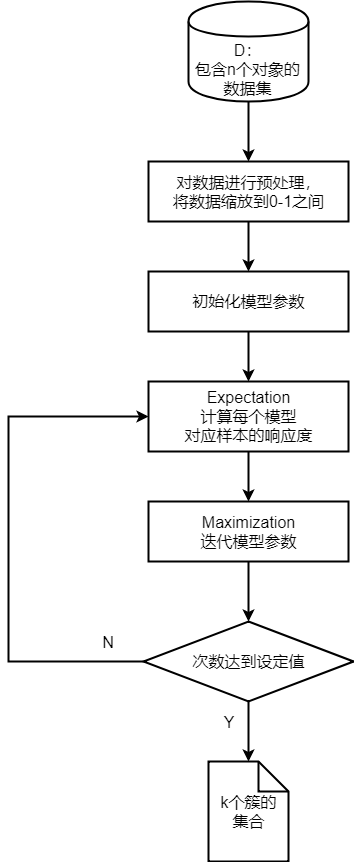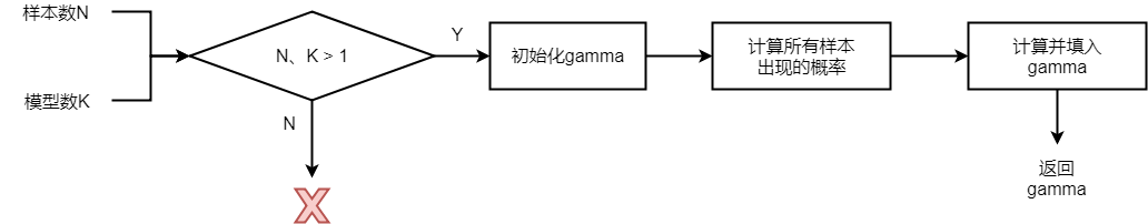 第三步为EM算法中的E步,用以计算每个点对样本的响应度。需要输入的参数除了mu、cov与alpha外还有样本矩阵Y。该步算法流程如图3.8所示,首先获取样本数与模型数,样本数与模型数均需大于1以避免返回结果的不一致。之后需要通过样本数与模型数初始化全为0的响应度矩阵gamma,在计算过个模型所有样本出现的概率(利用scipy.stats中的multivariate_normal进行计算)后计算每个样本的响应度并填入响应度矩阵中。