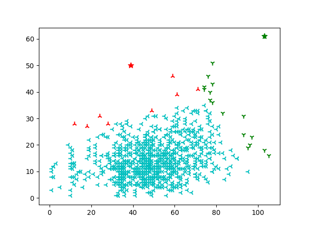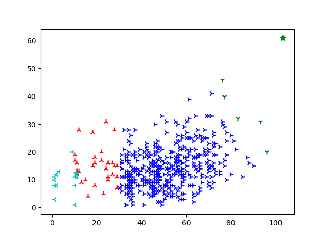 第五次测试出的结果图如图4.3所示。该错误聚类体现出了K-Means算法的缺陷,即k个初始点中心点的取值会影响K-Means的结果,最后生成的结果往往很大程度上取决于一开始k个中心点的位置,在中心点选取不理想的情况下容易陷入局部最优解。因此对中心点需要不断进行调整,但是在数据量非常大时这一过程的工作量是相当大的。