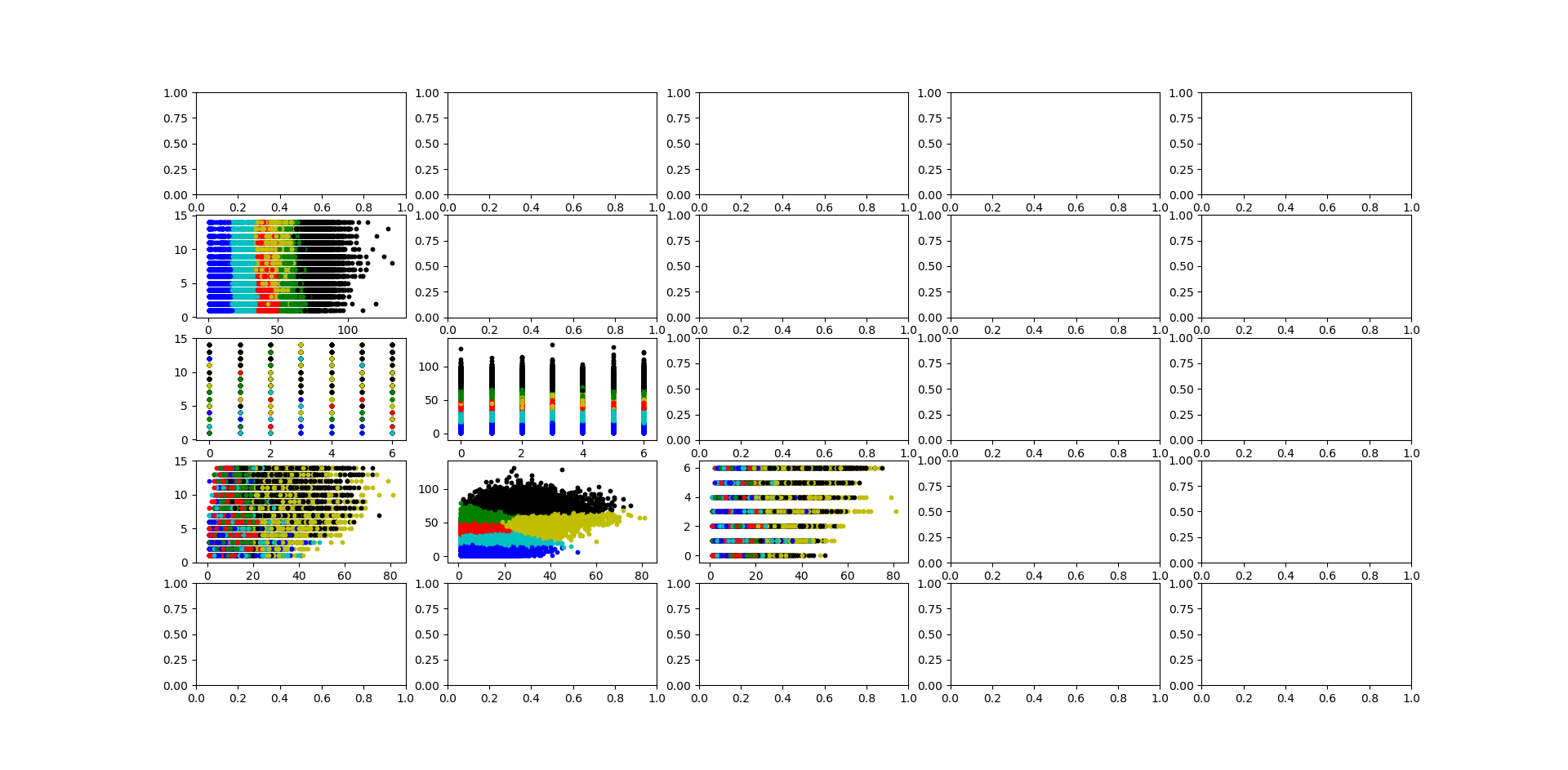 首先对10万条数据进行特定行、列组合的K-Means聚类(K=6)。结果如图4.7所示。之后再提取5000条数据、500条数据分别进行K-Means聚类,结果如图4.8与图4.9所示。通过对比我们可与发现取数据集中的500至5000条数据与10万条数据的聚类结果大体一致,故在接下来的聚类操作中可适当减少聚类总数以减少计算量。