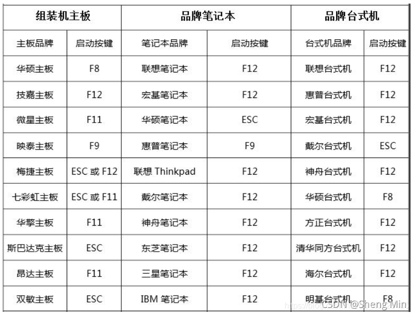 附带一个bios进入快捷键图表(先按开机键,然后按自己电脑所属的bios快捷键)