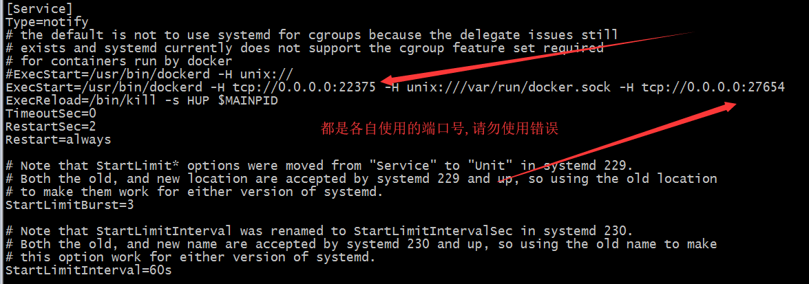 ExecStart=/usr/bin/dockerd -H tcp://0.0.0.0:2375 -H unix:///var/run/docker.sock -H tcp://0.0.0.0:7654