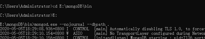 mongod.exe --nojournal --dbpath .(注意–dbpath后面有个点)
