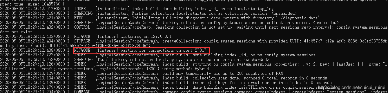 3.如果出现‘ [listener] waiting for connections on port 27017’提示说明服务器已经启动成功。如图