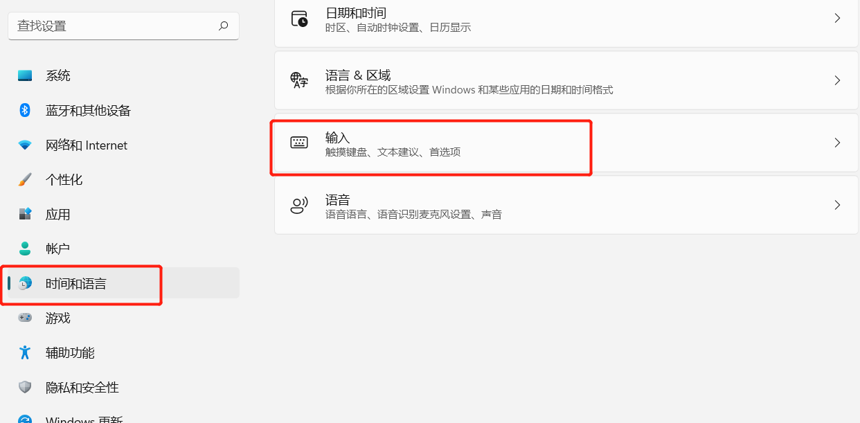 1.打开电脑(win11)的设置,选择时间和语言,然后点击输入,在输入里找到高级键盘设置