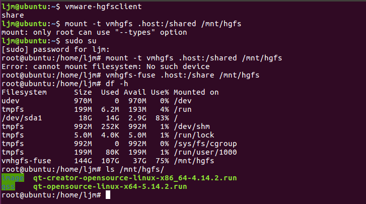 #vmware-hgfsclient 该命令用于查看当前有哪些共享目录,这里我只使用了share文件夹作为共享5,用vmhgfs-fuse命令完成挂载
