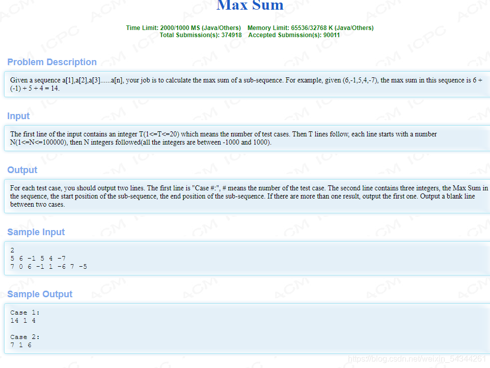 本题对最优的定义是和数最大(Max Sum);定义数组a[]用来接收一组测试用例的所有数字;我们定义结构体数组dp[],dp[i]用来记录以a[i]为结尾的最大子序列的信息,dp[i].x用来记录最大子序列起始位置,dp[i].val用来记录最大子序列的和。