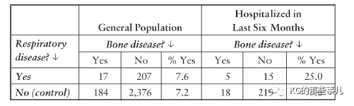 例如案例:在一般人群中,大约有7.5%的人患有骨骼疾病,这一比例与患者是否患有呼吸系统疾病无关。但是,对于患有呼吸系统疾病的住院患者而言,其骨骼疾病的患病率会升至25%!