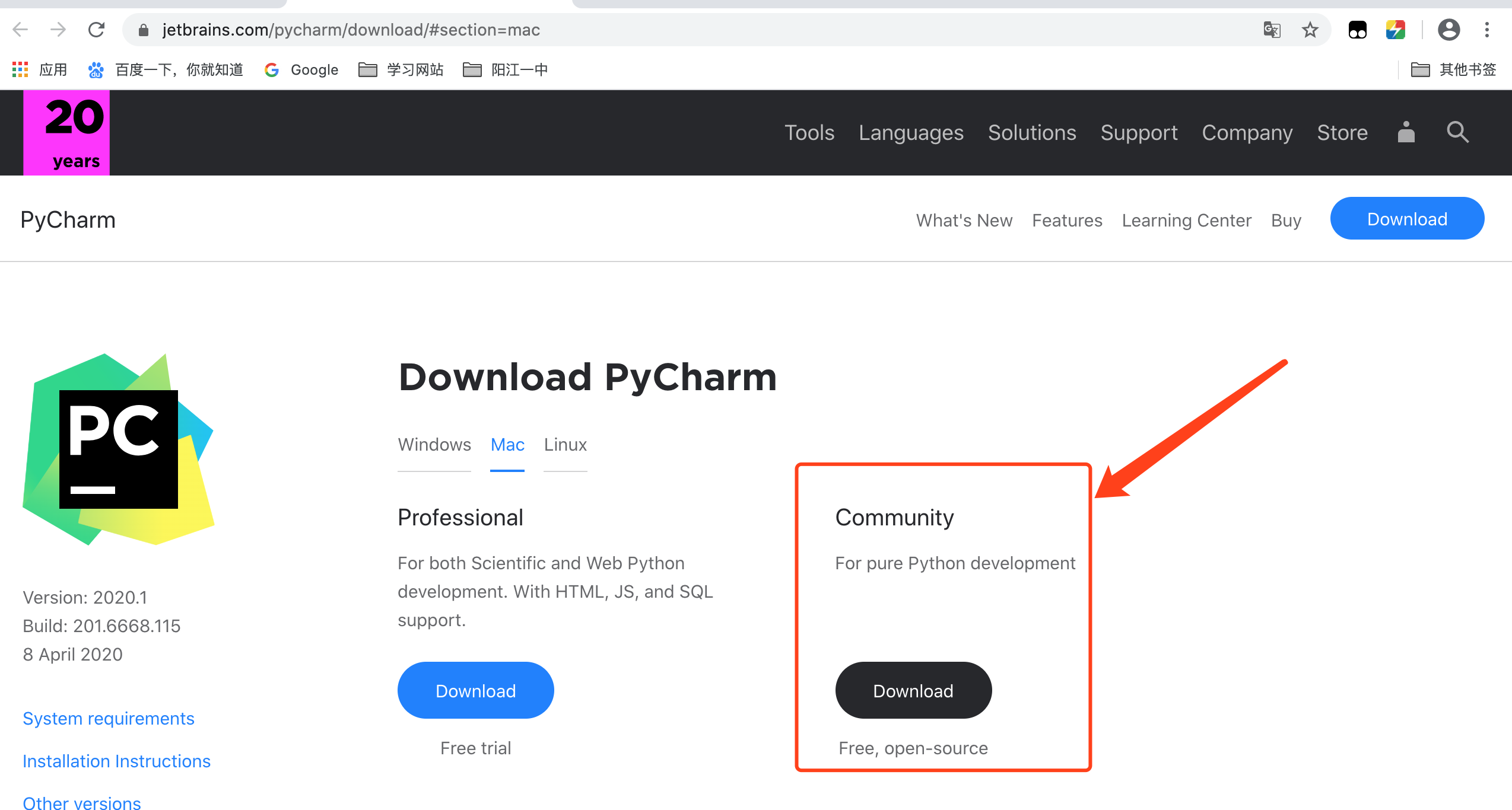 (1)官网下载PyCharm安装包:https://www.jetbrains.com/pycharm/download/#section=mac