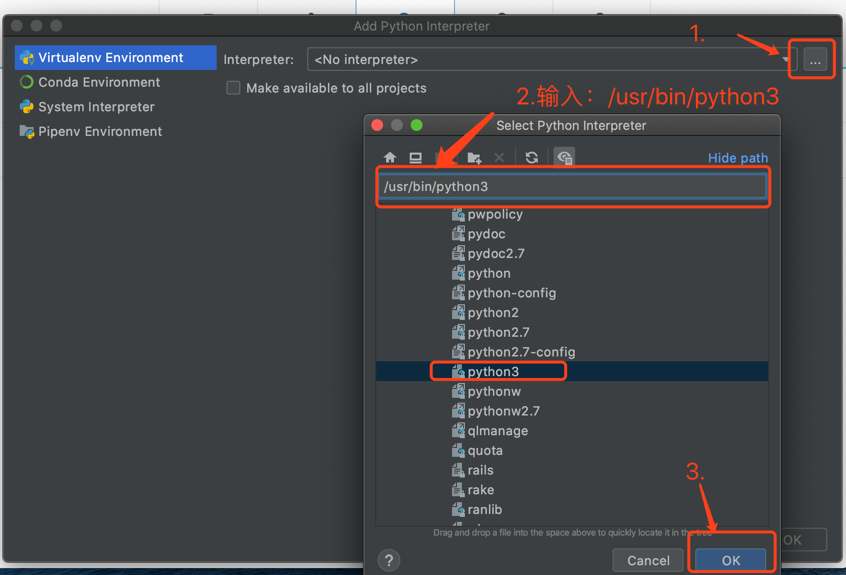 (以前位置是:/usr/local/bin/python3,等下打开Pycharm,选择解释器时要用到)