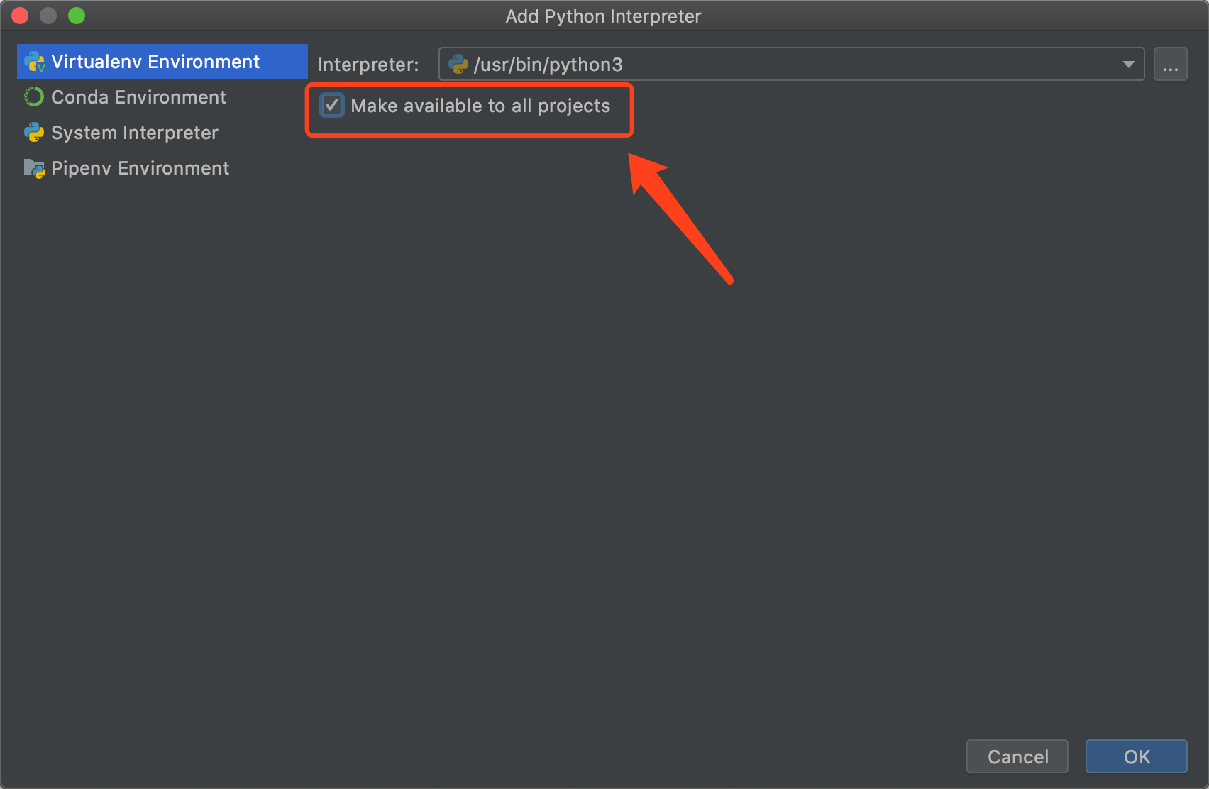 (4)勾选“Make available to all projects”,之后的项目就会默认使用python3