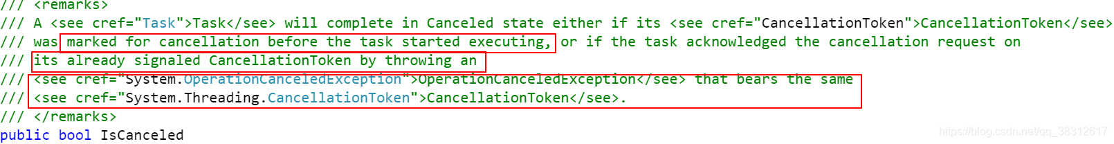 Task<TResult> FromCanceled<TResult>(CancellationToken cancellationToken)\\ Creates a Task that's completed due to cancellation with a specified cancellation token. 创建一个由于指定cancellation token取消而完成的task。